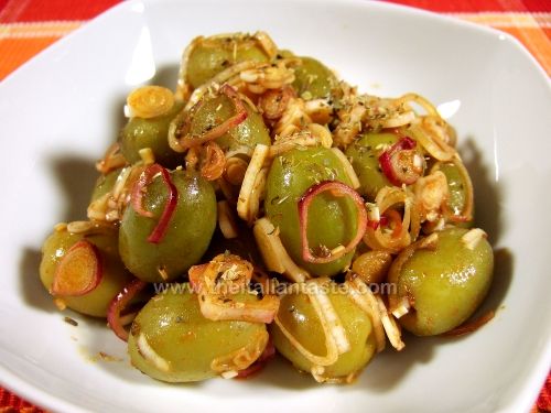Anche queste sono olive condite con i classici ingredienti mediterranei (cipolle, aglio, olio e origano) ma con l'aggiunta di peperoncino e qualche goccia di aceto rispetto alla versione madrilena.